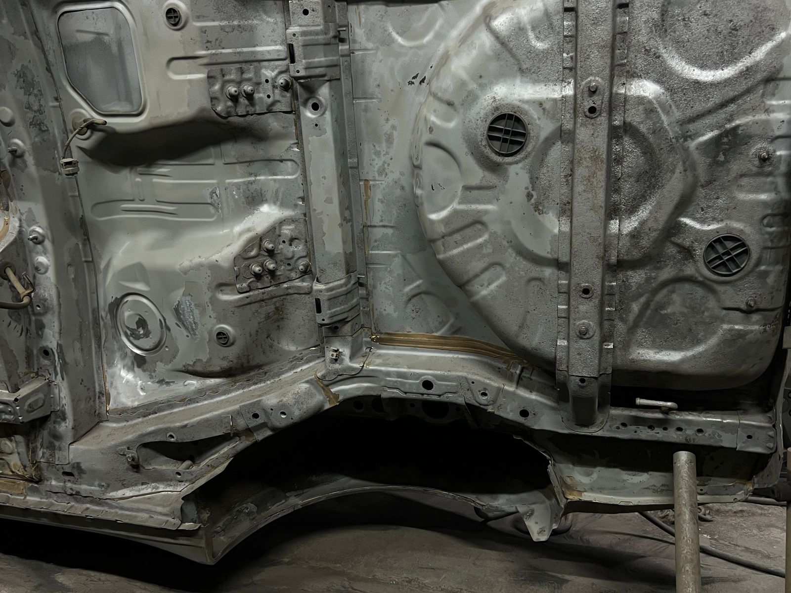 Сперва с автомобиля была снята передняя и задняя подвеска, тормозные трубки, бензобак и остальные элементы, чтобы иметь свободный доступ ко всем местам. Далее мы принялись за очистку металла пескоструем. Оценив состояние кузова было принято совместное решение исправить некоторые места, где требуются сварочные работы.